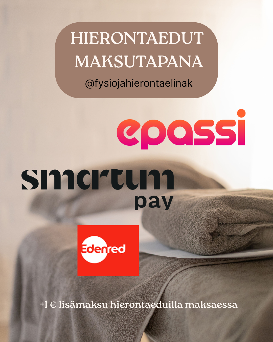 Kinesioteippaus on urheiluvammojen hoidossa ja liikunnan tukemisessa käytettävä menetelmä. Tukiteippaukset, ryhtiteippaukset, lymfateippaukset ym. Hieronta- tai fysioterapia-ajan yhteydessä lisäpalveluna tai varattavissa myös omana ajanvarauksena.