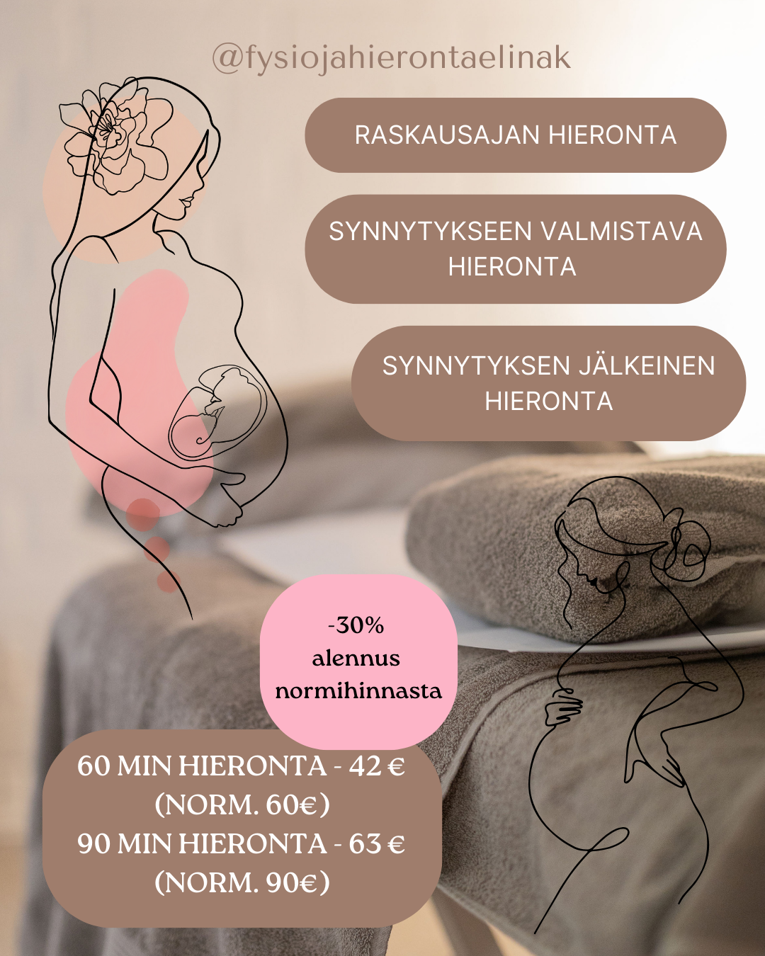 Tällä hetkellä varattavissa 60 min ja 90 min raskausajan hieronta sekä 90 min synnytykseen valmistava hieronta HARJOITUSHINNALLA (-30% alennus normihinnasta)!